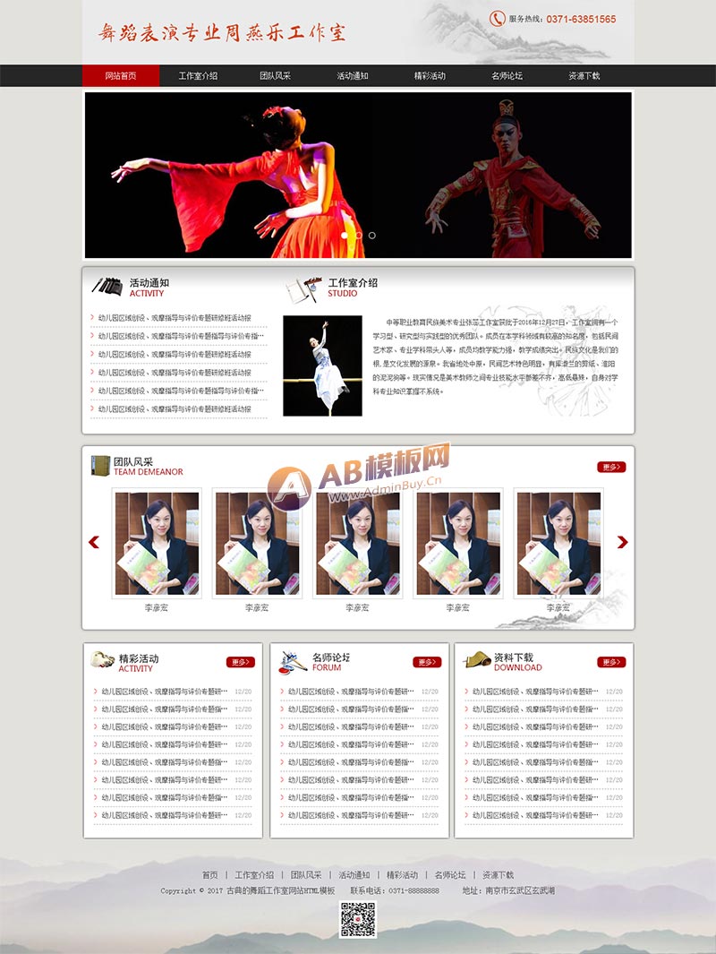 古典水墨风格的舞蹈表演学校,舞蹈专业培训工作室网站模板html下载。主要有:工作室介绍、活动通知、活动通知点开、精彩活动、名师论坛、团队风采、团队风采点开页、资料下载等总共9个页面。
