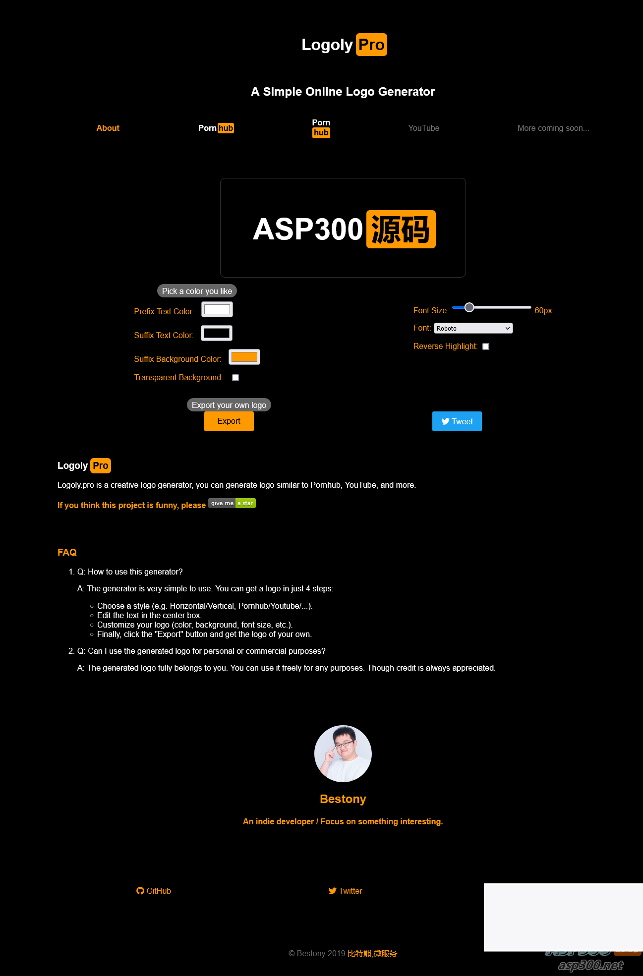 Logoly —— Pornhub Flavor Logo 生成器,一个简单的在线徽标生成器,适用于想要轻松设计徽标的人。生成像P站这样的徽标,下载您自己的PNG格式徽标,自定义徽标颜色,自定义徽标字体大小。